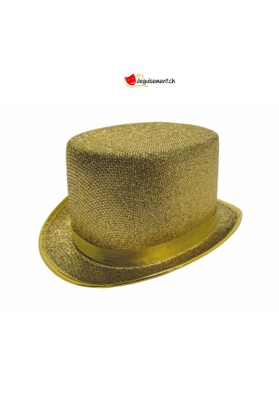 Chapeau haut de forme or pour adulte - Taille unique.Ce chapeau haut de forme pour adulte est agrémenté d'une bande de tissu satin jaune dans la partie basse du chapeau et est complétement dorée.