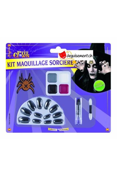 Kit maquillage sorcièreInclus : ongles, rouge à lèvres, tatouage et palette 4 couleurs
